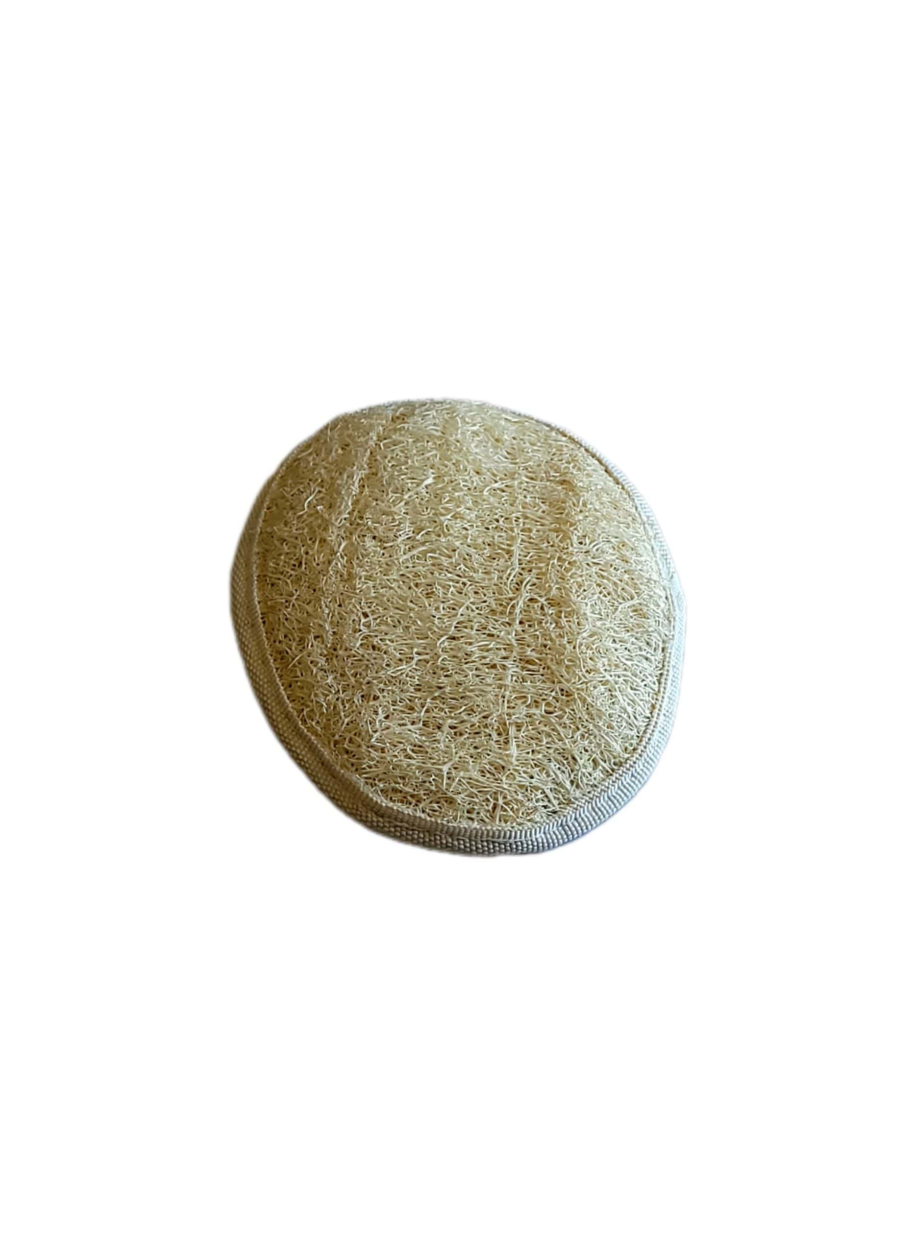Loofahs démaquillants ovales naturels. La face avant est en loofah naturel et la face arrière en tissu éponge en coton égyptien. Cet article comprend une poignée élastique pour faciliter la prise par les deux doigts centraux. Dimensions : 14 x 11,5 cm